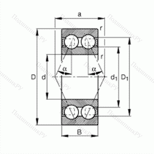 Основные размеры по DIN 628-3, двухрядные, угол контакта α = 30°